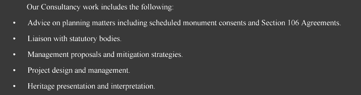 Archaeology and Heritage provides a professional interface with local planning authorities as well as the relevant government bodies. We provide advice to clients on all matters relating to the archaeological implications of any proposed development scheme from a single house plot up to major infrastructure projects such as mineral extraction sites, new roads, housing and industrial schemes.